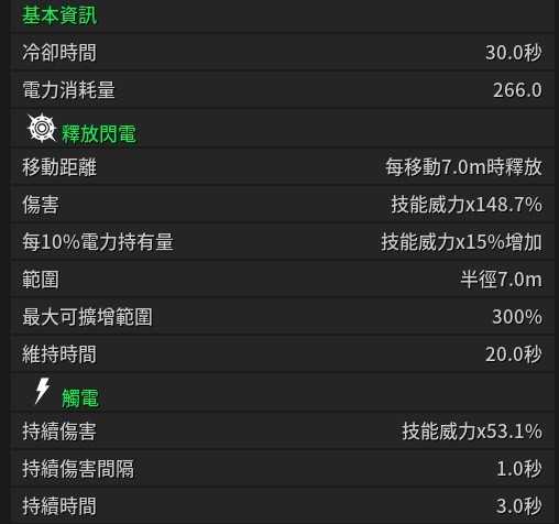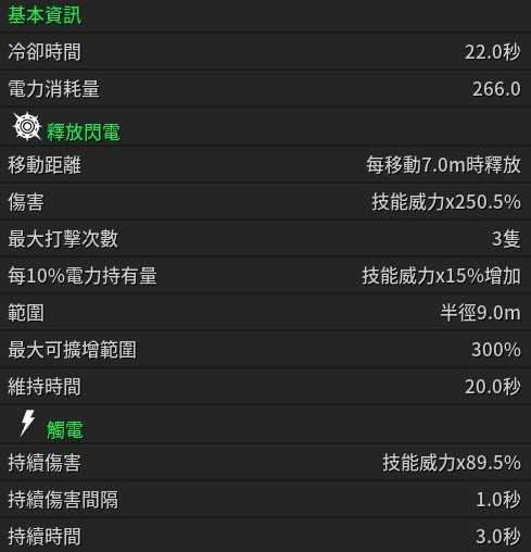 基础技能威力系数由148.7%提升至250.5%,目标对象变更一次电击仅击中三个(原本的电环是只要覆盖在范围内皆是有效攻击目标),半径额外扩增2米的有效范围,同时基础冷却时间由30秒减少至22秒且技能特效改为自动锁定敌人的雷电光束,可穿透障碍物攻击敌人,最后再进一步提升触电伤害。