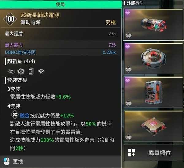 外部零件选用困难刽子手掉落的电系四件套,不强求(选用其他套追求生存,选用电套追求伤害),使用电套的情况下请尽量确保每个部位可以刷到有对应属性抗性、体力、防御等副词条最佳。