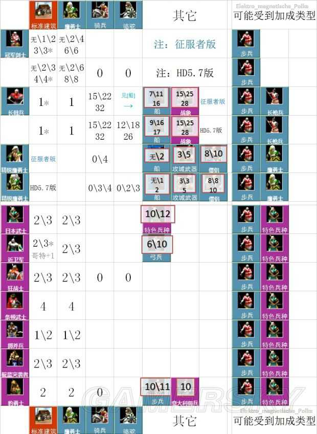 首先长戟兵对[骑兵]护甲属性具有32点加成,对[战象]护甲属性具有28点加成,对[船]护甲属性具有16点加成(征服者版本)。