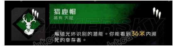 如图,猎鹿帽,别名:鹿头。这个用法很多,最直观的就是方便找趴着的人。第二点就是有时候你砍趴人了,但没有时间去挂人,得先找其他人,要靠鹿头盯着,防止被救。第三就是用来勾引队友救人,36米的距离足够让人听不到心跳声。一般在还剩2个人的时候比较