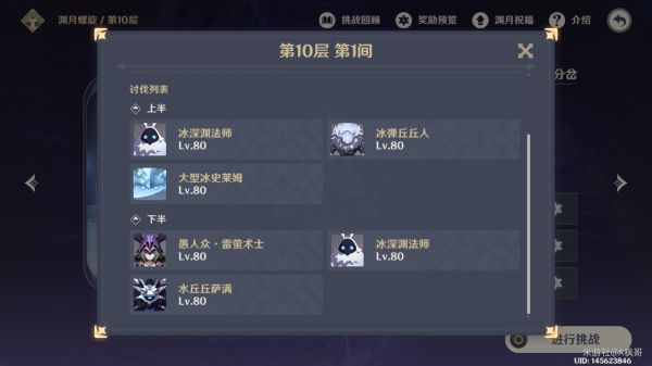 冰系主c是最优选择,风系主c练度拉满一波带走也很舒服,当然一般看攻略的都是还没拉满的,冰系一定要带俩个上下给一个,下半没有大剑或者岩系在第二间下半场开局一定要把岩系愚人众秒了。