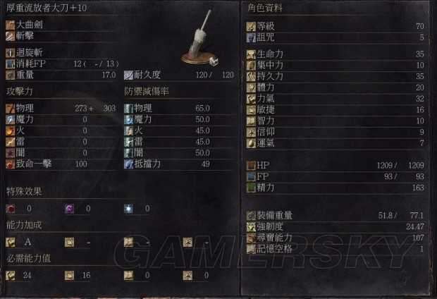 说厚重最离不开的例子就是流放了,一个厚重从B补直升到A,32力双持就有576的面板,同力量下的冰狗锤只有530左右,最强的尤姆大柴刀是610(然而同精力下只能打3刀剩一丝,流放能5刀)