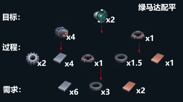 每有两台绿马达的制造台,你至少需要建造6台铁块冶炼设备、3台磁铁冶炼设备、2台铜块冶炼设备。