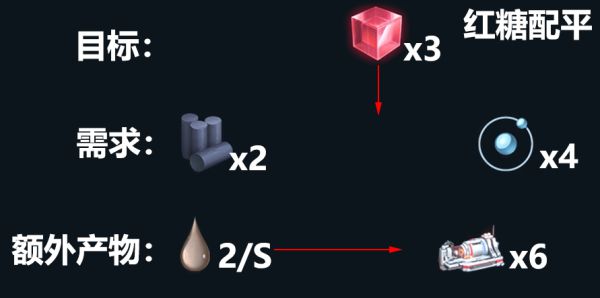 值得一提的是,生产红糖会额外产生大量的精炼油,每生产3个红糖,就意味着每秒有2个精炼油。在没有学会X裂解以前精炼油就只能拿来放火电厂烧掉,而且游戏初期也是比较缺电的,所以建议额外产出的精炼油就拿来给火电厂供电就好。