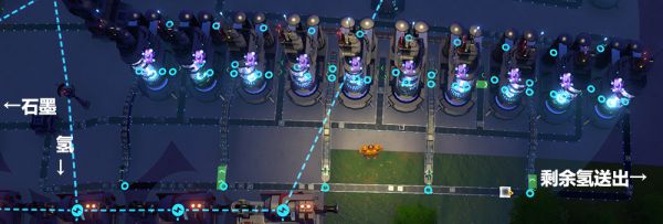 这里给大家一个X裂解的设计参考方案。产物用分流器分离石墨和氢,氢绕回来供给精炼厂裂解所需的氢,而多余没用完的氢再顺着生产线去往它所需的地方,这样就不会出现精炼厂因为缺氢而无法循环的问题了。