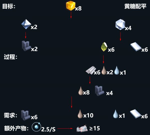 黄糖算是初期第一个有难度的研究产品,主要是合成有机晶体非常吃力。虽然后期可以飞其他星系后,有机晶体可以随便挖,但前期没有那个条件,只能老老实实地挖原油合成塑料来解决了。