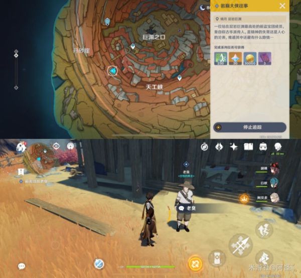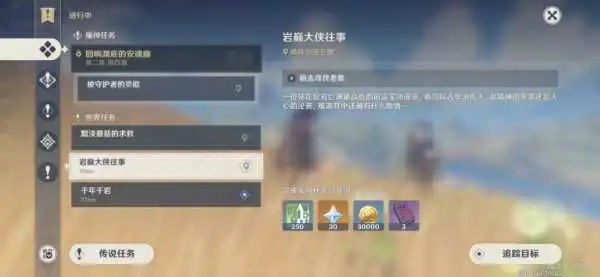 想要玩挖宝游戏的小伙伴们不要急,要先将世界任务「岩巅大侠往事」做完,奖励也是非常的丰富:30原石、250经验、30000摩拉、3本紫色经验书。