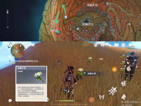 1、首先前往丹砂崖的如图点位,摘取【远眺之花】相关任务「千年千岩」。