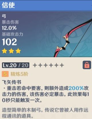 信使这把武器适合弓箭副C的情况,当你的弓箭手切出来放元素战技为主要手段,普攻只需要重击一两下时,信使是你的最佳选择。