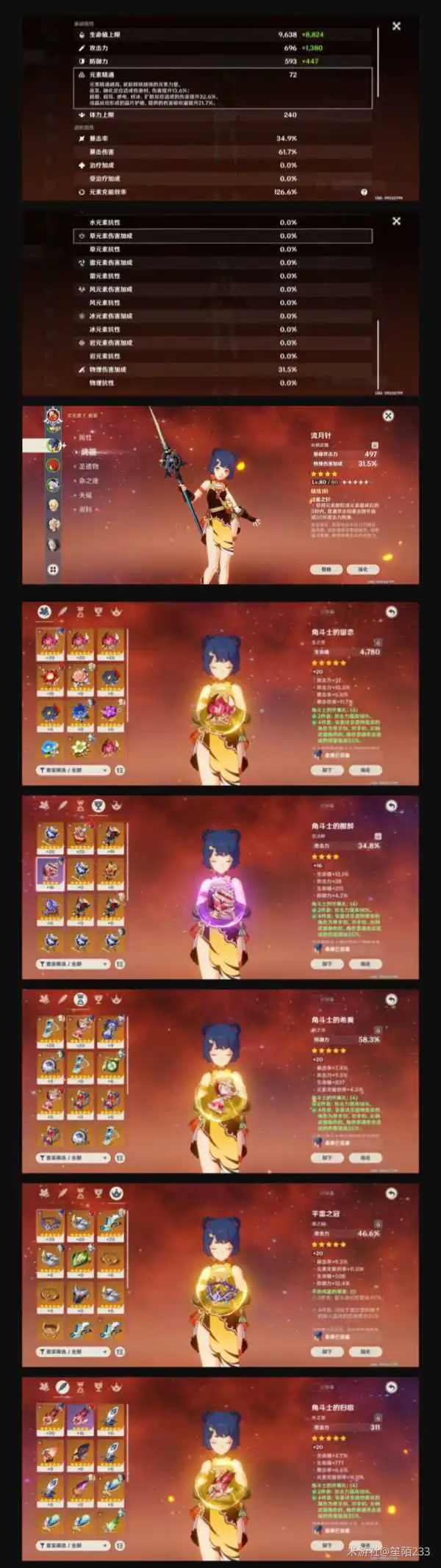 也不太推荐魔女套,因为魔女套的话加的是元素精通但是香凌主c的话,一般都是靠普攻和重击来打伤害所以本人推荐香凌带角斗套。