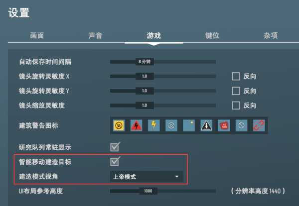 菜单→设置→游戏→建造模式视角/智能移动建造目标