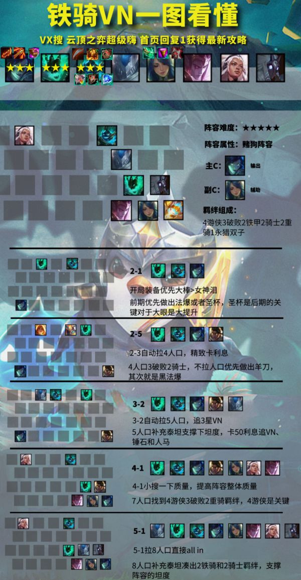 阵容主C是VN,赌VN阵容有两种玩法一种是赌6破败的VN,另外今天我推荐的赌铁骑4游侠VN。