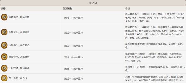 二命: 质变命座 ,在四岩队的情况下大招从18scd 70能量变为13.5scd 52能量 ,大招本身持续时间为11s ,加上岩队需要切人丢技能充能量的cd时间 ,在实战中可以当作是可以让一斗无缝的命座 ,非常建议抽取。