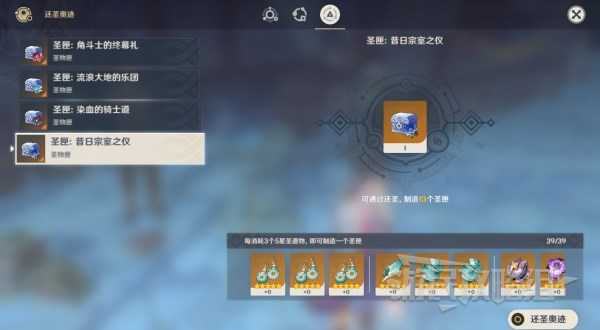 合成比例为3:1,就是放入3件圣遗物还圣可获得1件随机新圣遗物,一次最多可换13组,也就是最多放入39个。因此建议一次性积累约40个不需要的5星圣遗物再进行还圣。当然也可以每集3个就去还圣,但获得理想圣遗物的概率比较低,一次放满的效率会相对较高一些。
