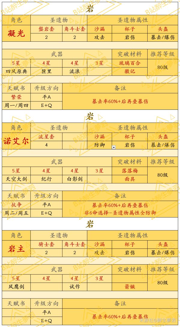 《原神》中岩系主角还是比较多的,小伙伴对于岩系角色的装备选择及体力的消耗还不是很清楚,下面给大家带来了由“醉生夢泗”整理的《原神》岩系角色装备及体力消耗日程表汇总,希望能帮助到大家。