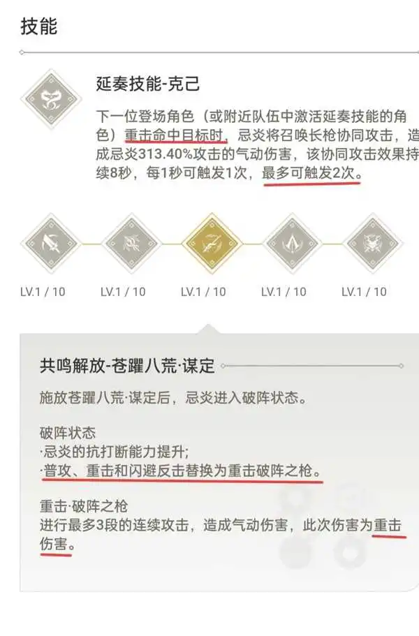主C,主要靠开大以后全技能转化为重击输出的主c,算重击伤害,吃重击加成!并且退场技能是为下一个角色提供两次重击伤害后台输出!吃的忌炎自己的伤害能力,但是靠切的那个角色打出动作指令!