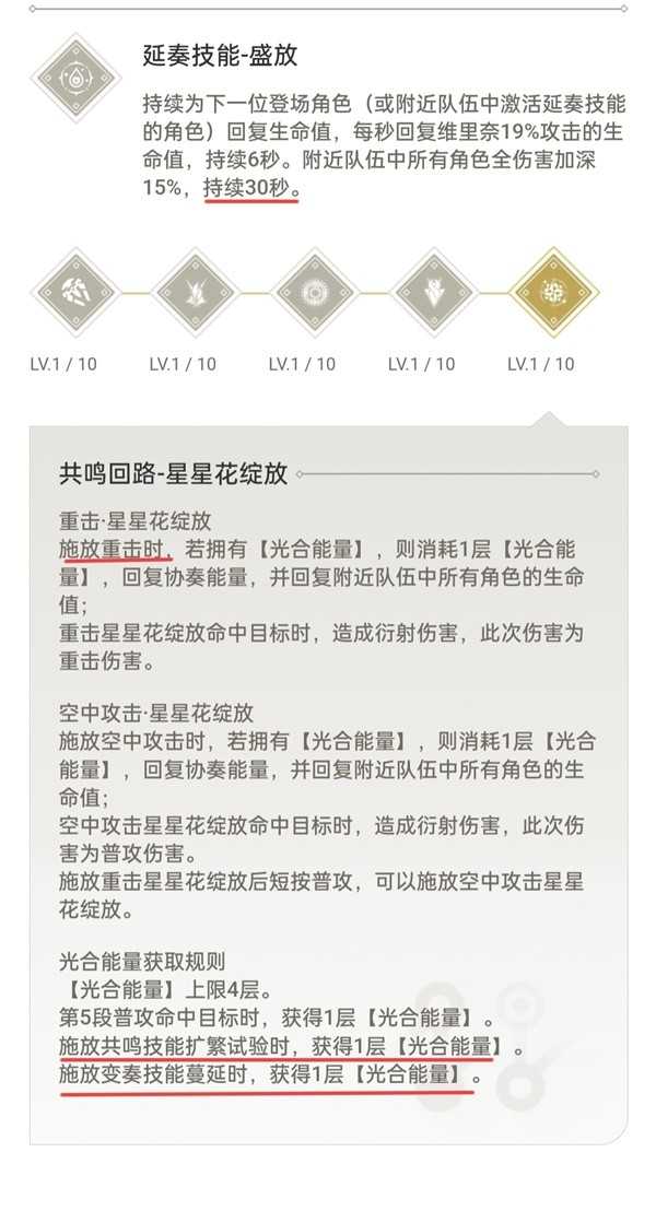 奶辅,现版本真神,并且为了保值率高!提供30秒的伤害加成(但是只有15%以后肯定会被上位替代),并且维里奈站场输出的时候主要就是打出自己的光合作用来回血!并且触发能量恢复,而这个光合作用的来源就3个,吃到延奏技能,小技能,站场平a五次,而这里我们最主要打的就是,吃到延奏技能和小技能的两次(千万不要去吃平a五次来的那个光合作用,维里奈倍率低,并且被打断平a又要重新计算,是非常浪费时间并且利用率低的方法),而这样子看,维里奈能打出的就只有两次重击来触出两次光合作用,这样子就正好对上了忌炎离场技能的两次后台跟随伤害,nice!