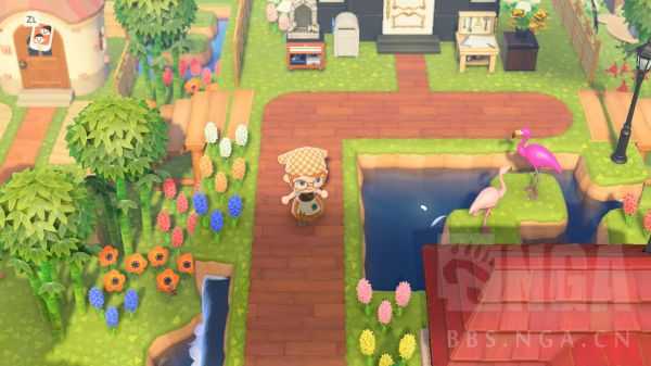 家门,为了不让地形一眼望去全是平地,试着把自己的屋子用一层悬崖撑起来,顺便制造了左右两边的瀑布,门口用湖中岛的方法摆放了雌雄火烈鸟, 都是我家羊送我的