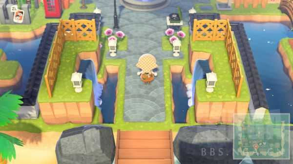入口,从机场出来直到服务处的路 用两个一层瀑布包围道路是最开始的想法,因为制造瀑布后必会多出一排空白的悬崖,我喜欢使用一些家具或者花朵进行装饰,这里使用的是栅栏和花园灯。