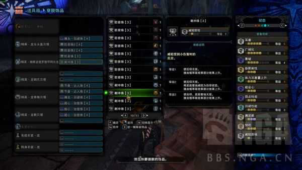 满会心是最简单粗暴提高输出的方式,耳塞5和体力3也保证你的生存概率,让你可以摸清怪物的攻击方式。达人三护石材料全部取自本体,得到方式简单。相比腾龙套输出肯定低一点,但是生存方面确是大大的提升