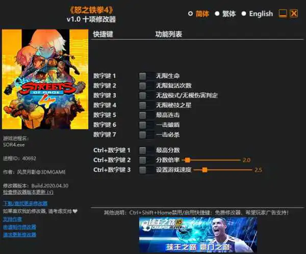 简体、繁体、English,可以切换语言(切换语言后修改器将把该语言设置为默认语言)。