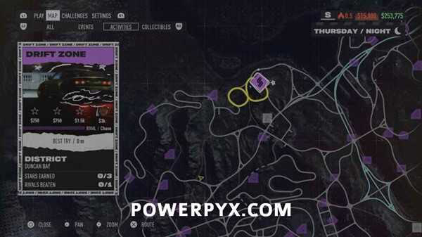 本文将按照游戏内的区域顺序列出所有漂移区域活动的位置,下图高亮显示的图标及黄线就是漂移活动所在地。