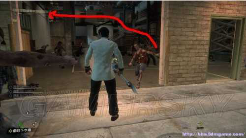 沿着厂房楼梯上到2楼后,从左侧的窗口跳到一个平台