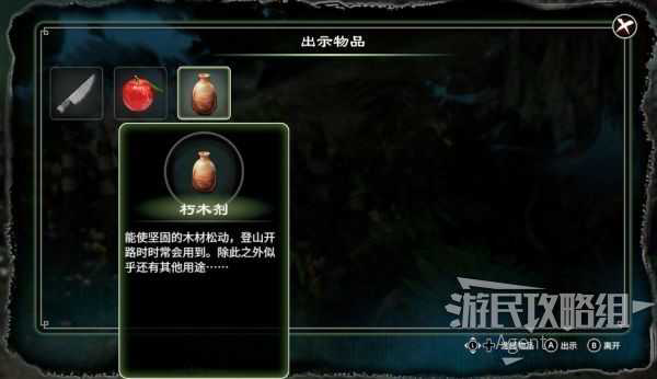 往前走遇到个大箱子,用鼠标右键/手柄LB可显示行动菜单,选择点燃、出示、运劲、破坏四种行动。这项操作非常有用,后面常会用到。