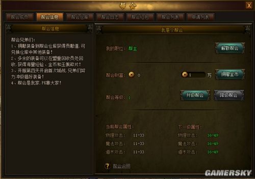 帮会信息:显示帮会的基础信息,并且可以对帮会升级、捐赠等操作;