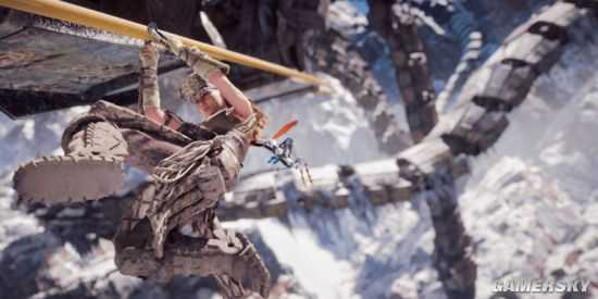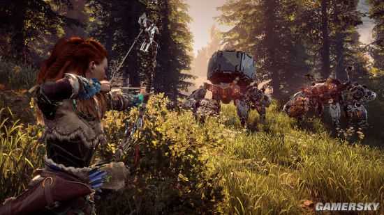 于是女主通过悬崖上的绳索独自潜入了据点里,通过草丛里吹口哨扔石头等下流的骗小孩的招数(捂脸)女主成功的暗杀了附近巡逻的哨兵,远处的哨兵也被主角冷箭一一爆头,剩下的就剩据点中心里的几头被劣化的可怕机器了。