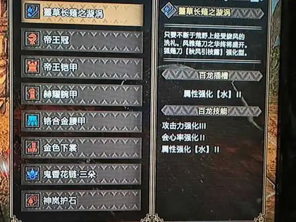 护石同上,负会心肯定要拉正的然后就是经典刚刃锁斩位,输出肯定是毛笔棍最高但是论舒服程度还是泡狐龙舒服自己取舍吧(刚刃每过90s就需要磨刀有点小断节奏)