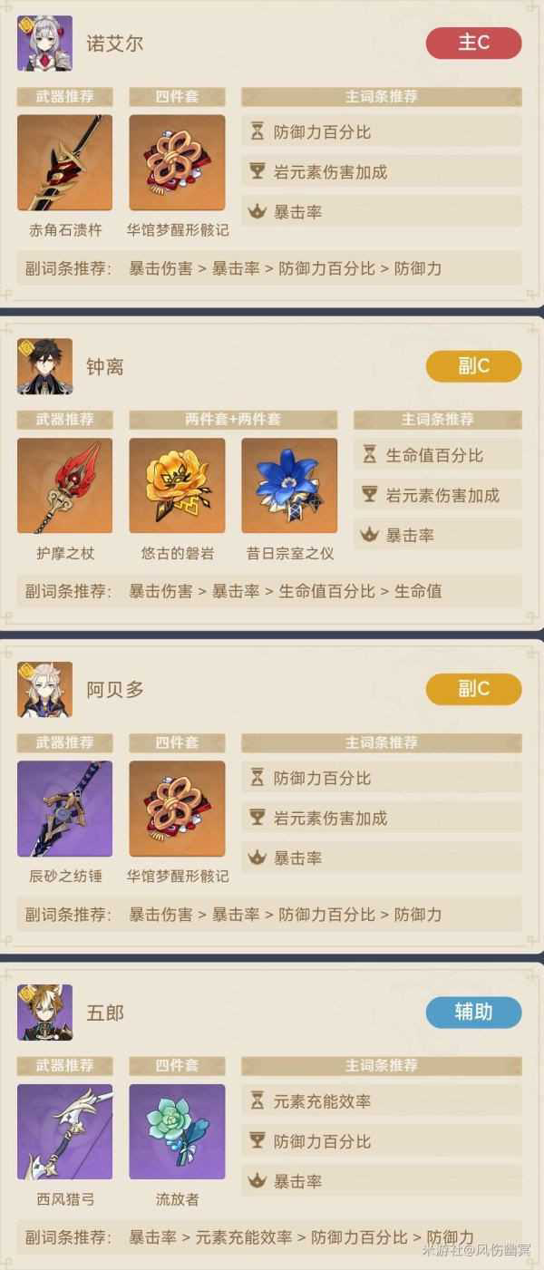 钟离先上盾抗打,五郎E辅助阿贝多,五郎Q提高全队防御力和满命的爆伤,诺艾尔旋风斩,自己的攻击和钟离共鸣和阿贝多在后台持续岩伤,全队舒适。基本不会中断循环,钟离和阿贝多大招该用就用。