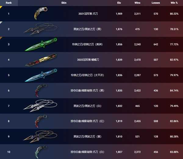 《无畏契约》的皮肤因为外感和特效的原因,对操作手感有着一定的影响,外网的皮肤排名会根据玩家的比赛数据对皮肤进行排名,下面为大家带来《无畏契约》6月20日外网皮肤排名,一起来看看吧。