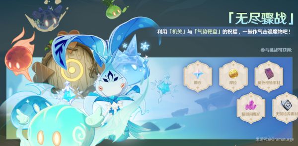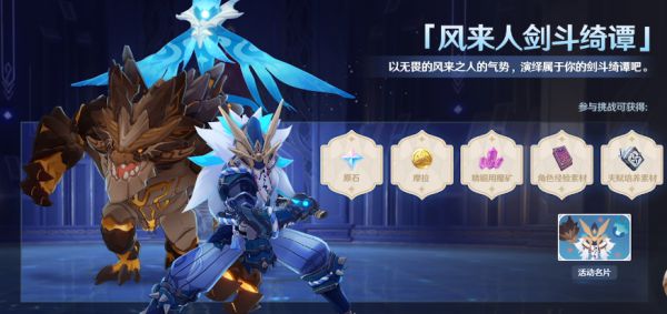 玩法介绍:通往未知秘境的门扉已经开启,隐身其中的是前所未有的强敌。以无谓的风来之人的气势,演绎属于你的剑斗绮谭吧。活动期间,旅行者可在活动秘境中,挑战前所未见的强大首领,获取挑战积分。挑战积分累计达到指定目标可领取活动专属名片纹饰「庆典·斗剧」等奖励,首次通关挑战关卡更可获得原石奖励。
