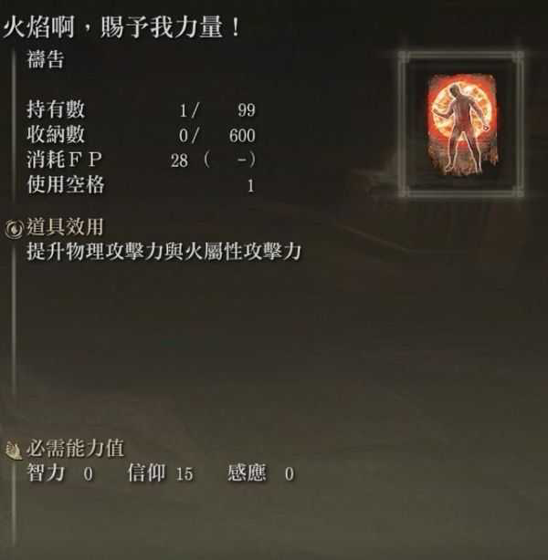 火焰啊,赐予我力量!增加物理攻击力还有火属性攻击力(对黑夜彗星无效)。