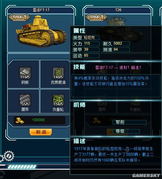 《战车少女》雷诺FT-17轻坦属性及制造材料详解。