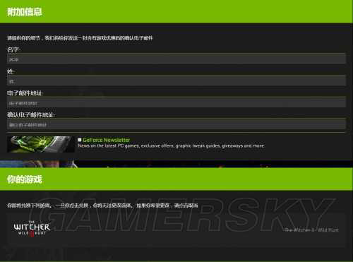 输入网址https://redeem.geforce.com/zh-cn/,前往NVIDIA的优惠码兑换网页,上方将巫师3优惠码输入进去,下方选择出生日期(须已满18岁),然后“继续”进行下一步。