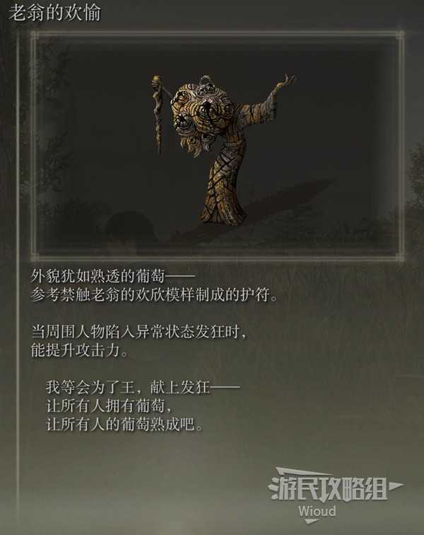 BOSS战时将祖灵角换成老翁的欢愉(陷入发狂增伤),其他护符依然携带狂龙护符(增伤)、亚历山大的碎片(战技增伤)、火对蝎(火焰增伤)。