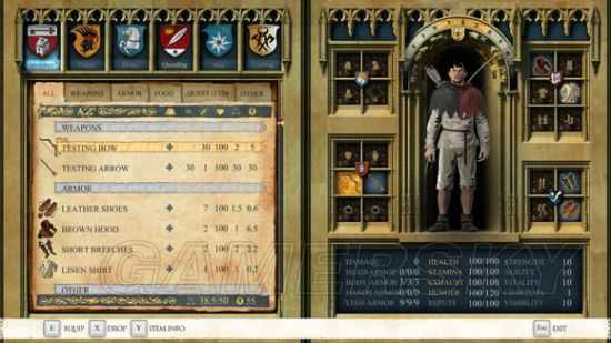 之后去找弓箭手,他习惯于坐在射箭场的椅子里面。弓箭场地大概在东南边?总之跟着他走来就成。对话可以下10金币赌注获得射箭赌局机会,玩家朝靶面射10支箭,射中红色区域得3分,黄色2分,蓝色1分,只要获得10分以上就可以获得15金币奖励。金币更多时可以下更大的赌局赢更多的钱,但钱在目前版本里除了下赌注完全没有作用。