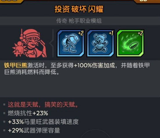 铁甲巨熊激活时,至多获得+100%伤害加成,并随着铁甲巨熊消耗燃料而降低。