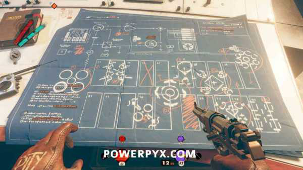 - 停用核反应堆:打开反应堆后方的面板,按正确顺序剪掉不同颜色的电线就可以停用核反应堆。在象形图#3所在的房间中,电池充电器旁边有一张蓝图,上面画着四根标着序号的电线,记下序号的顺序。然后进入形象图#4所在房间的通风口就能来到核反应堆后边,敌人应该不会发现我们的,按顺序剪短电线就可以停用反应堆。
