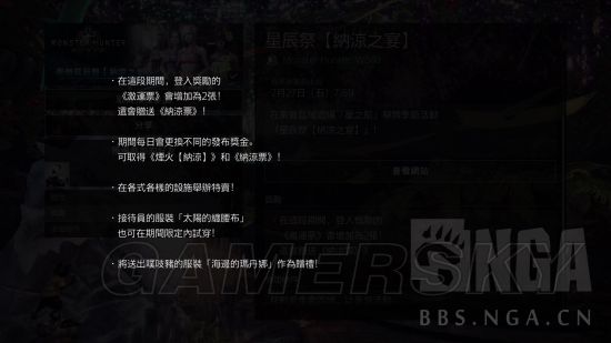 《怪物猎人世界》继星辰祭的开花之宴后,在炎热的夏季即将开展纳凉之宴的活动。关于活动的具体内容请看下面的《怪物猎人世界》星辰祭纳凉之宴活动一览,大家一起来看看吧。