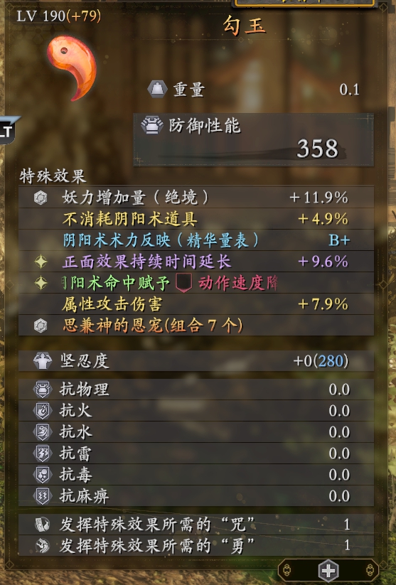 另外还有一个要说的点就是配件上的阴阳术术力反映(精华量表),测试量表100%时加31or32的术力,比固定词条要高,可以考虑洗出来并且养成捏零食的好习惯。还有一个术道具的伤害随缘选择,反正阴阳术输出也只占小头(是我没有在酸dbq)