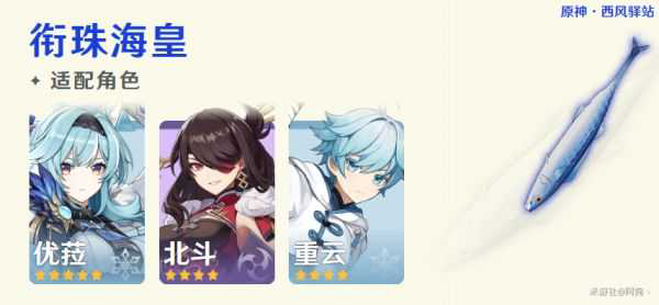优菈:优菈的元素爆发伤害很高,优菈的元素爆发以及天赋潮卷冰削造成的伤害都能享受到衔珠海皇的加成效果,其自身作为物理主C,自身的物理加成也能提高衔珠海皇特效造成的物理伤害。