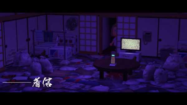 日式拉门、房间地板、简单壁板、垃圾袋、晾衣杆、纸箱、壁挂式风扇、无线电话、茶几、20寸液晶电视、白铁水桶、壁挂式电话、散乱的文件。(晾衣杆会随电风扇飘动)