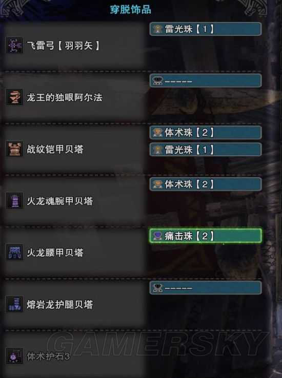 这是一款偏向会心输出的配装,空的格子放强弓强弹即可。