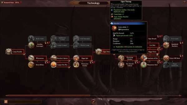 他们对研究的概念主要是偷窃、想办法吃得更多、收取更高的雇佣费,或者吃掉敌人的脑子来发现新奇玩意儿。他们的科技树也反映了这一点,一些关键节点都是增加营地数量、营地初始人口这些方面,让你能够更快地进行扩张。