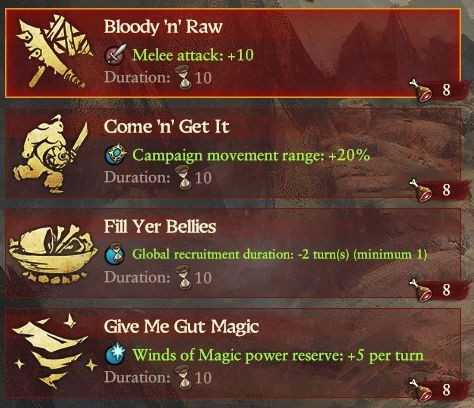 此外,所有食人魔军队都能向大胃神献上祭品,用一些肉食换取加成。此举能为军队提供多个回合的增益,共有以下几种: