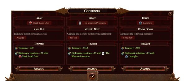 每十个回合,你都将获得三个备选合同,内容分别是袭击城市、击杀人物或是摧毁军队。这些合同来自未与你交战的派系,并会在完成时给予金钱。完成了雇主派系的合同后,还会大幅提升你们的外交关系。