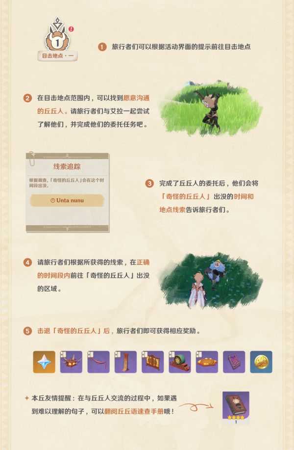 旅行者们可以通过寻找和帮助愿意沟通的丘丘人,来获得与「奇怪的丘丘人」有关的线索。